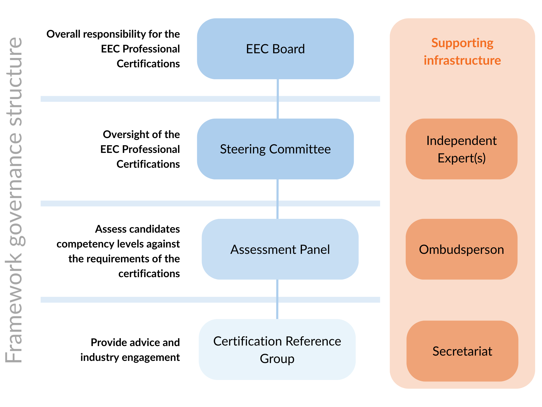 EEC Professional Certifications – formally known as the EEC Professional Certifications Framework – has been designed to be impartial and meet the needs of customers, energy services providers, governments and the general public. As with all EEC activities, the EEC Board is ultimately responsible for the proper management of the Framework.